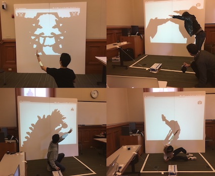 With the mix of these features, users can create shadow artwork in playful environment. Shadow Play resembles the thought process and planning of an actual painting. Just as an artist would plan ahead where certain objects would be placed within the space before making the strokes, Shadow Play users have to deliberately organize the angle and distance of their body in order to perfect the layers of shadow into a single object shape. Such deliberation allows for more playful and interactive activity. By having the augmented shadows displayed on the screen, there is a loop of feedback and manipulation as users constantly refer to the captured shadow to make adjustments accordingly.”